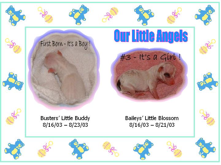 | Our newest little angels at the bridge. They were just too tiny to go on. They brought us a little bit of joy for the short time that they were with us. But they had a higher purpose, to go to the Rainbow Bridge and play with Madison and Mr. Jones, running free without pain or hunger anymore. Take care my sweet ones, we will meet again! | ||